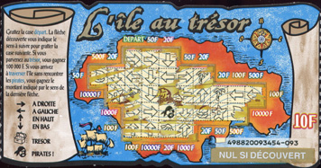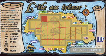 Principe du jeu: il fallait gratter les cases dans l'ordre des flêches. Soit vous tombiez sur un coffre (gain 100.000 F), soit vous tombiez sur une tête de pirate (perdu), soit vous arriviez sur une case gain (20 à 10.000 F).